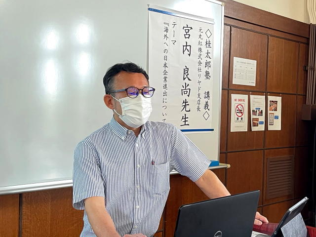 5月22日(土)は、元丸紅株式会社リヤド支店長の宮内良尚講師が「海外への日本企業進出について」と題して、総合商社の仕事や海外駐在時代の苦労話についてお話ししました。そして、これからの社会に生き抜くためには、まず独自の専門性をしっかりと持ち、企業人として社会貢献と説明責任をきちんと果たすことが必要だと学生たちを励ましました。