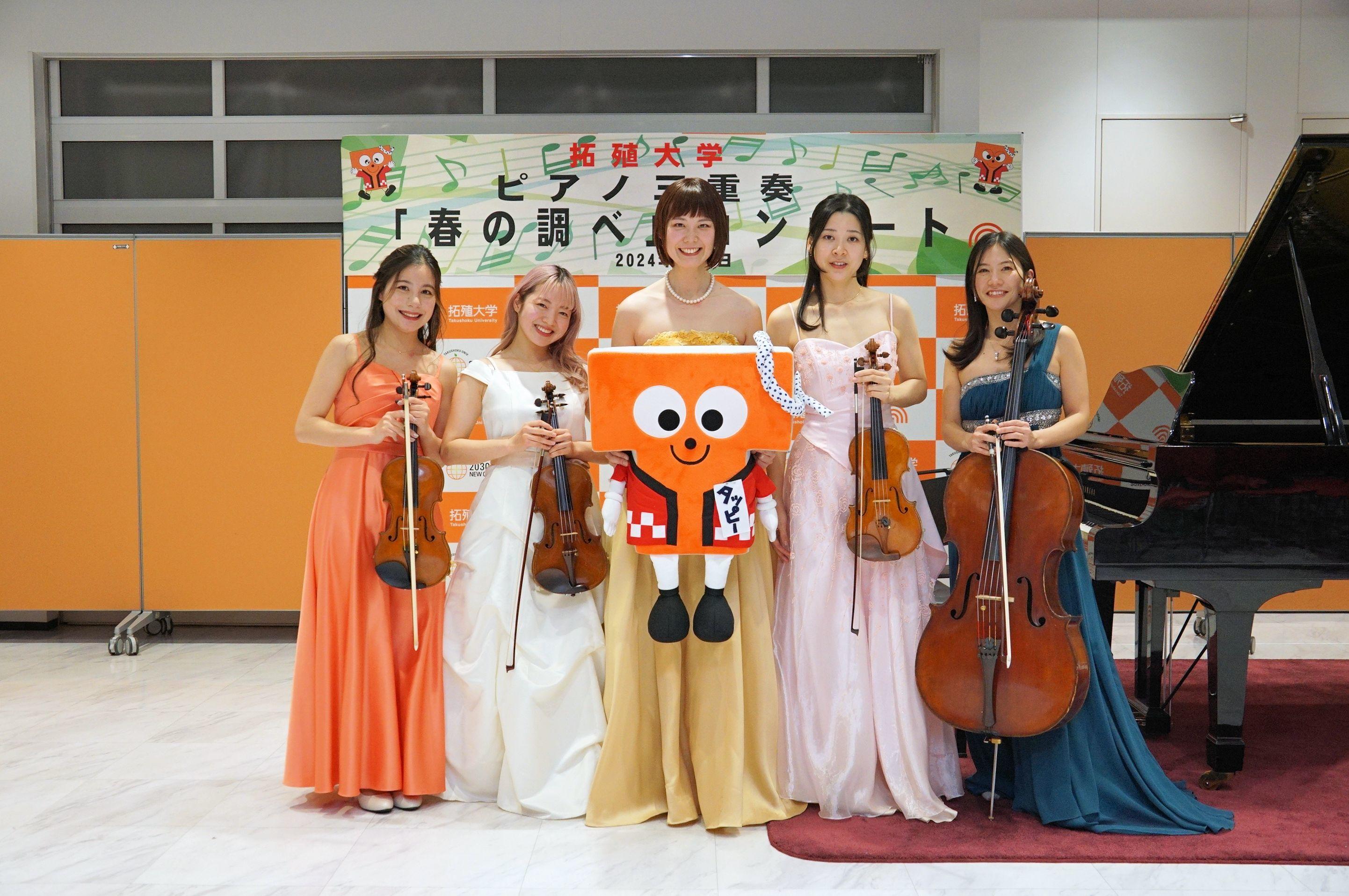 午後6時、E館学生ホールには小さなお子様を含め多くの方が集まる中、ピアノ、チェロ、ヴァイオリン3名のプロの演奏者はきらびやかなドレスで登場し、冒頭ピアノ三重奏用に編曲された本学の校歌の演奏が披露されました。その後クラッシック、Jポップ、ディズニー、童謡、ジブリと次々に美しい音色が奏でられ、会場は温かい空気に包まれました。