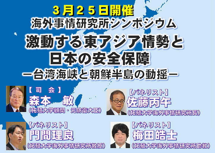 | 登壇者 | 【司 会】 ・森本 敏(拓殖大学顧問・元防衛大臣) 【パネリスト】 ・佐藤 丙午(拓殖大学海外事情研究所所長) ・門間 理良(拓殖大学海外事情研究所教授) ・梅田 皓士(拓殖大学海外事情研究所助教) |