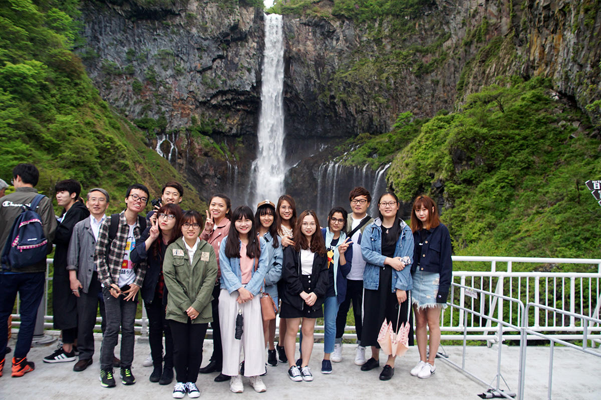 別科生81名と学生交流支援会の学生(別科生をサポートする学部生)10名及び教職員を含めた総勢101名が17日朝茗荷谷駅を3台のバスで出発。 東北自動車道を経由して華厳の滝に到着しました。学生達は美しい滝に大はしゃぎで写真を撮り合っていました。