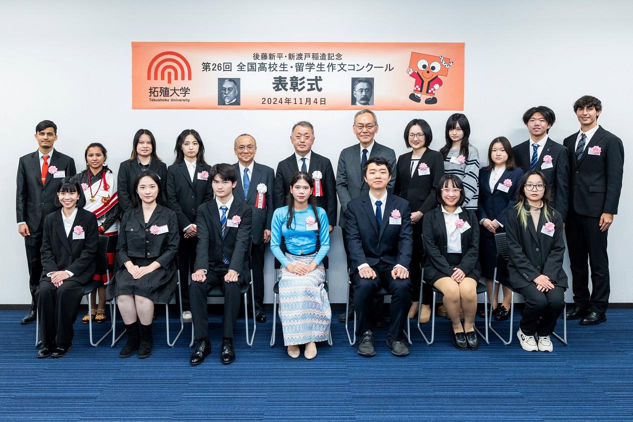 今年第26回を迎えた全国高校生・留学生作文コンクールの表彰式が11月4日(月)に行われ、別科日本語教育課程の学生2名も表彰を受けました。今回のコンクールは①「世界の懸け橋となる国際人とは」、②「多文化共生に向けた私のアイデア」、③「私の異文化交流体験記」、④「私にできる社会貢献」の4つのテーマから選択する形で募集をし、2399件(うち、留学生部門286件)もの応募がありました。別科では、日本語能力試験(JLPT)N2以上を目指す日本語中上級レベルの学生が、授業の一環として毎年応募します。