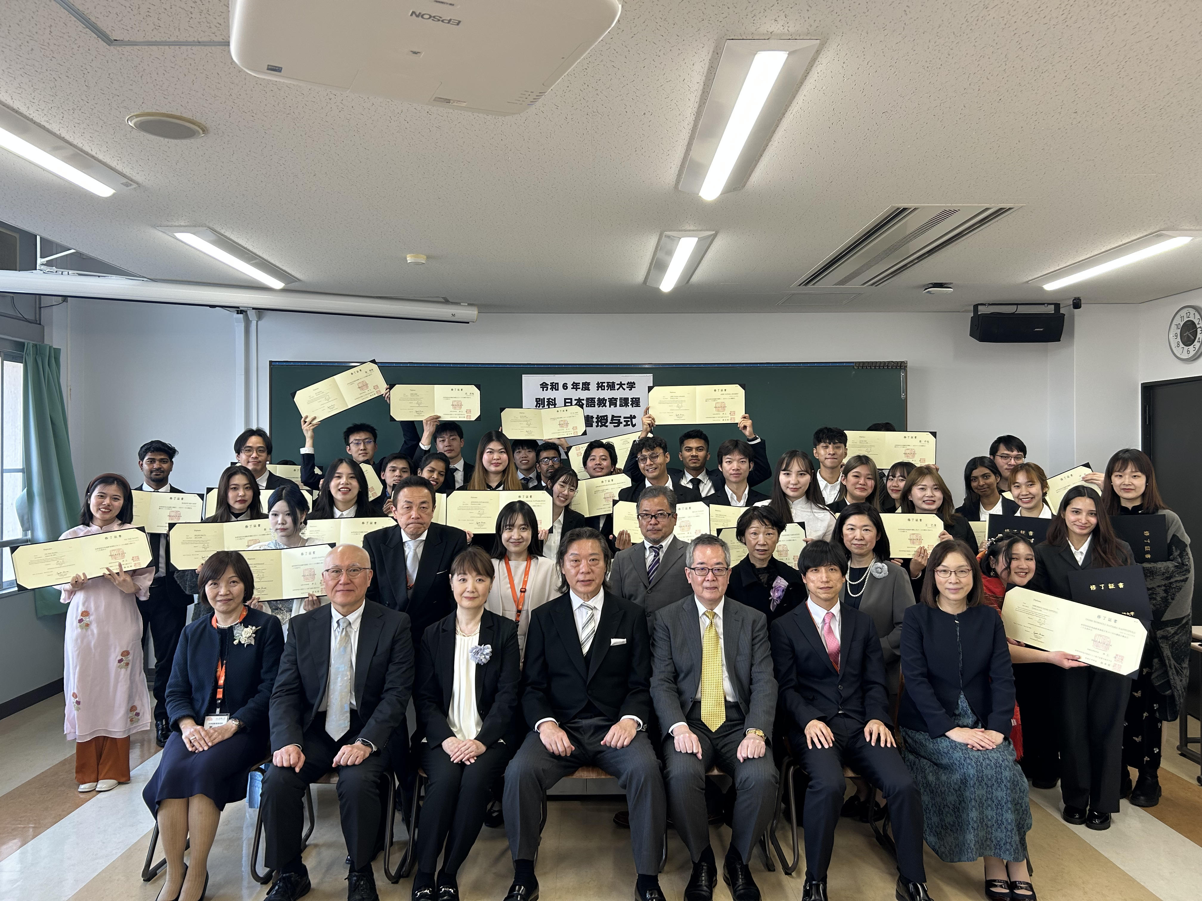 3月22日(土)、拓殖大学八王子国際キャンパス(東京)にて、学部合同開催の「拓殖大学卒業式」と、それに続く「別科日本語教育課程修了式」が行われました。出席した別科修了生は、緊張しつつも、修了証書を胸に、自らの門出を喜んでいました。ご家族が母国から来日し出席されている修了生もいて、皆、それぞれの進路に向け、これからの活躍を心に誓いました。