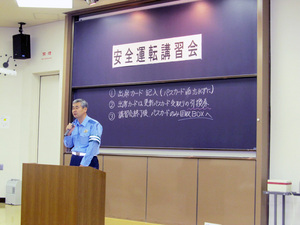 八王子国際キャンパスでは、通学に、自動車・二輪車を登録制により構内乗り入れを許可しております。現在の登録者は自動車登録者100名、二輪車86名です。乗り入れ者を中心に交通安全運転講習会(講義・二輪車実技)開催しました。